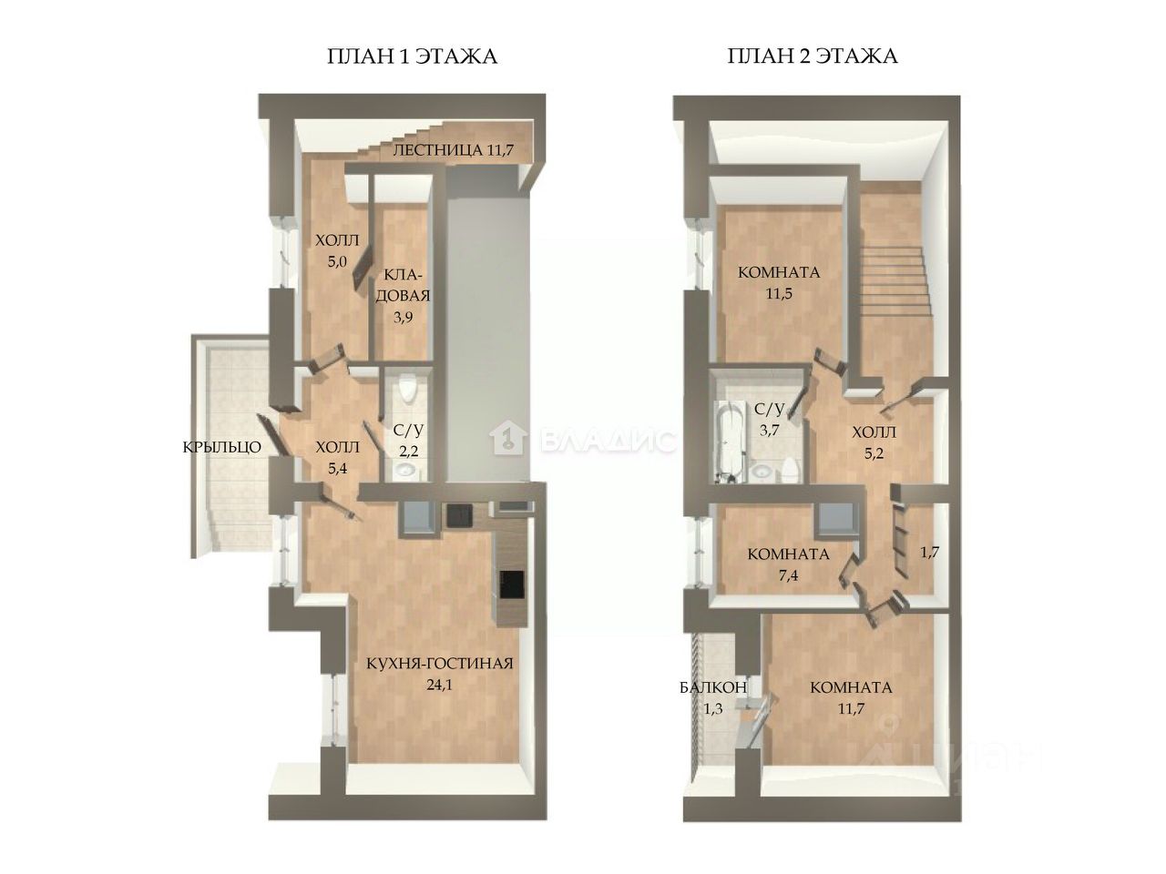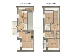 -2 этажа: на первом - кухня-гостиная, с/у и кладовая, на втором - три комнаты и с/у.