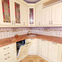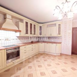 - Кухня-столовая 20,8 м² с выходом на широкий застекленный балкон (восточная сторона, утреннее солнце).В кухне гарнитур в стиле кантри кремового цвета, оборудован встроенной техникой (духовка, вытяжка, варочная панель, посудомоечная машина), холодильник.