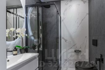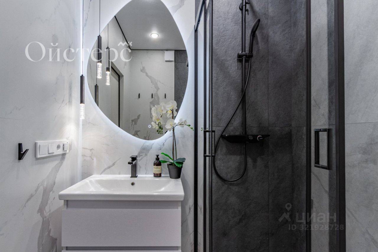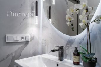 В ванной комнате: душевая кабина с тропическим душем, смеситель Villeroy & Boch, подвесная система с гигиеническим душем. Отделка ванной комнаты: широкоформатный керамогранит; полы с подогревом; теплая стена; предусмотрено место для установки проточного бойлера для нагрева воды.