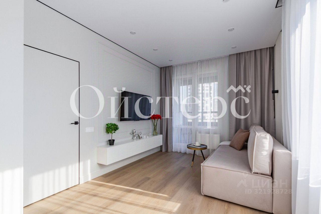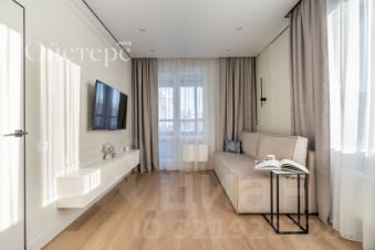 В жилой комнате: лоджия площадью 3,15 м² (на полу керамогранит); раскладной диван; телевизор с функцией смарт ТВ; система хранения; текстиль на окнах.
