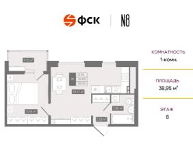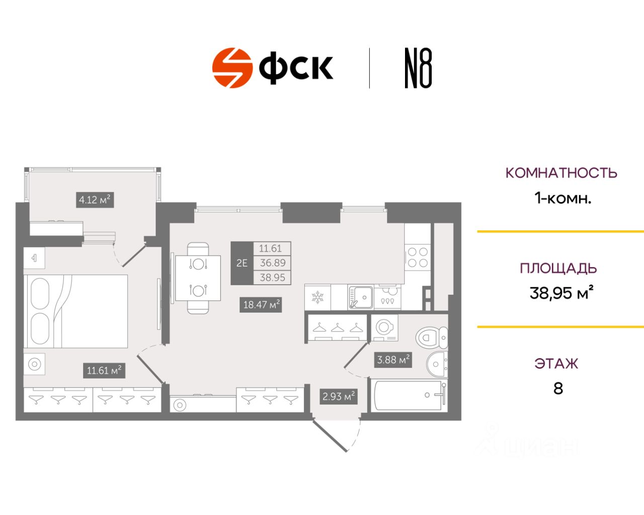 Прямая продажа от застройщика — только в этом месяце. 1-к квартира в клубном доме N8 на 8-м этаже. Общая площадь 39,05. Без отделки.