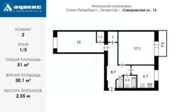 Продаётся двухкомнатная квартира в кирпичном доме в самом сердце Петергофа по адресу: ул. Суворовская, д. 13.