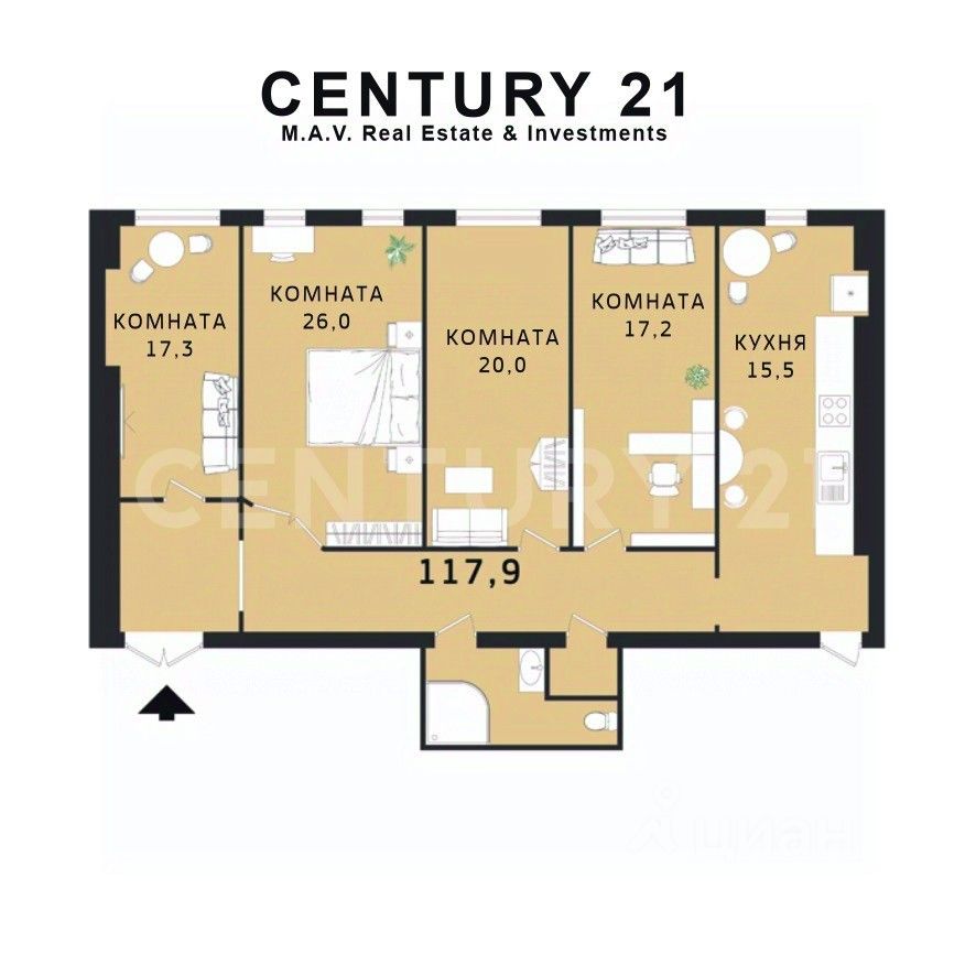 4 изолированные комнаты 17,3+26,0+20,0+17,2 м2 правильной формы. Возможна практически любая перепланировка