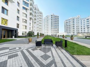 • Элегантная архитектура: Лаконичные фасады из светлого керамогранита с золотыми колоннами и панорамными балконами создают атмосферу роскоши.