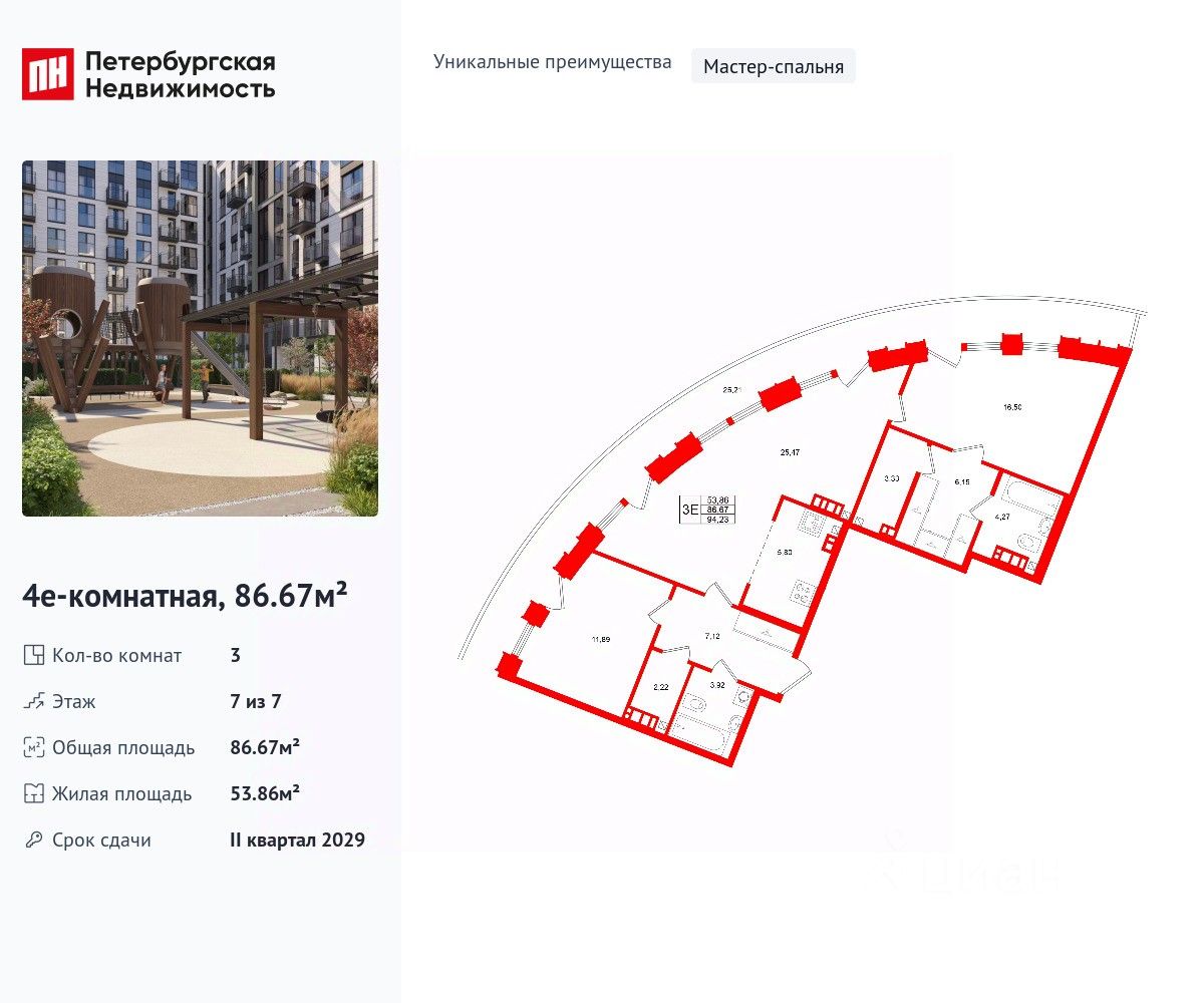 Уникальная, функциональная европланировка, вместительная прихожая 7.12 м². Общая площадь квартиры - 86.67 м², жилая 53.86 м², высота потолка 3.6 м.