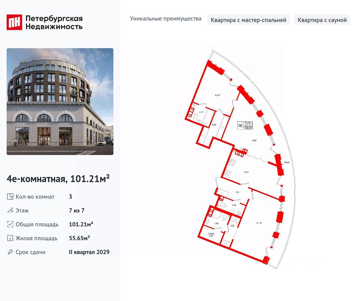 Уникальная, функциональная европланировка, большая кухня-гостиная 16.87 м², вместительная прихожая 5.91 м². Общая площадь квартиры - 101.21 м², жилая 55.65 м², высота потолка 3.6 м.