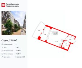 Удобная, классическая, функциональная европланировка, просторная прихожая 3.28 м². Общая площадь студии - 23.99 м², жилая 17.33 м², высота потолка 2.98 м.