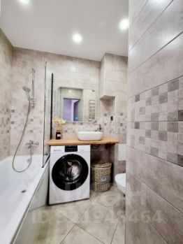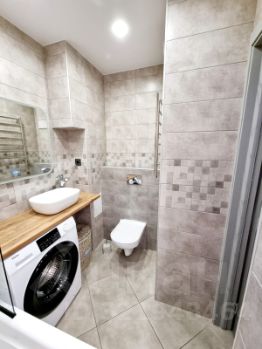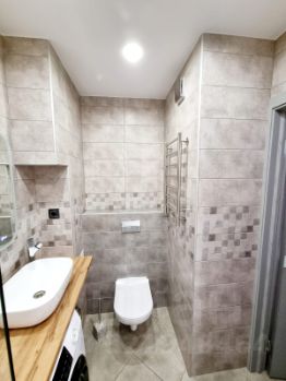 Санузел совмещен с ванной комнатой, установлена хорошая сантехника, электрический полотенцесушитель с возможностью регулировки нагревания (приобретался в специализированном магазине), имеется ниша для хранения с встроенной подсветкой, оборудовано место для установки стиральной машины, отделка стен и пола выполнена плиткой, натяжные потолки с точечными светильниками, дополнительное освещение в виде подсветки на зеркале.