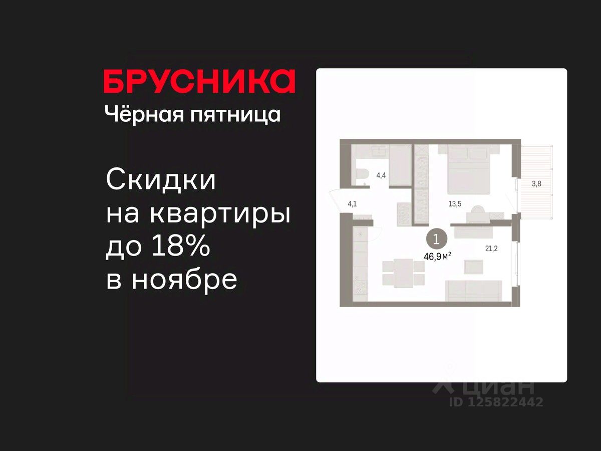 Однокомнатная квартира от застройщика с предчистовой отделкой в ЖК "Брусника в Новоселье" на 5 этаже. Общая площадь: 46.93 кв.м., жилая: 13.5 кв.м., площадь просторной кухни-столовой: 21.2 кв.м. Все окна выходят на одну сторону. В квартире один балкон, один совмещенный санузел. Высота потолков 2.7 м.