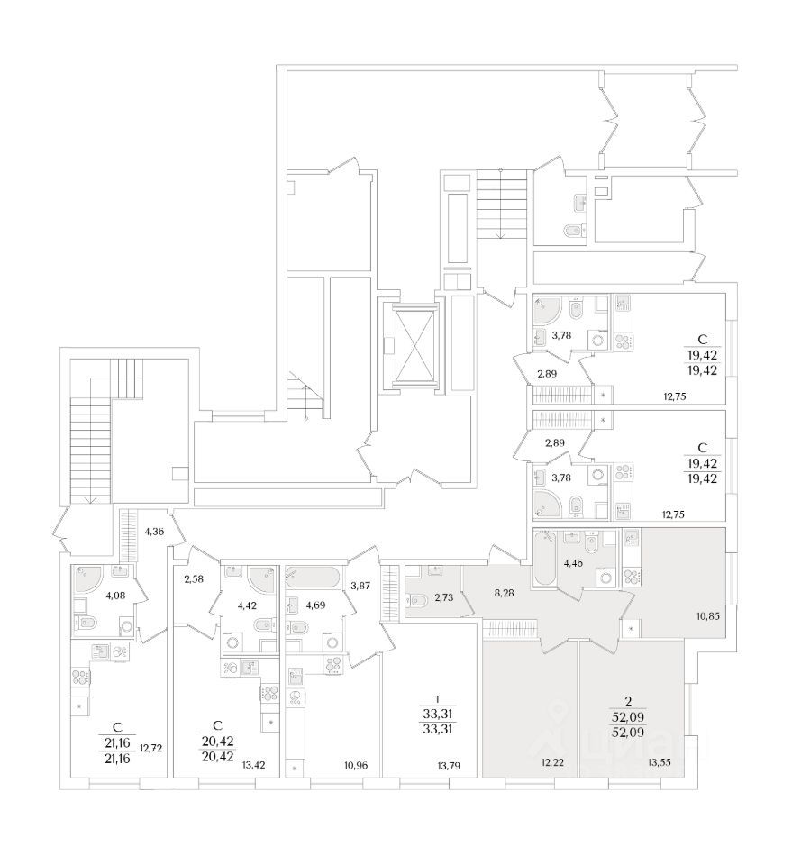 Квартира находится в 9 этажном доме, в Очередь 2, Корпус 2 на 1 этаже. Общая площадь квартиры 52,09 кв.м.