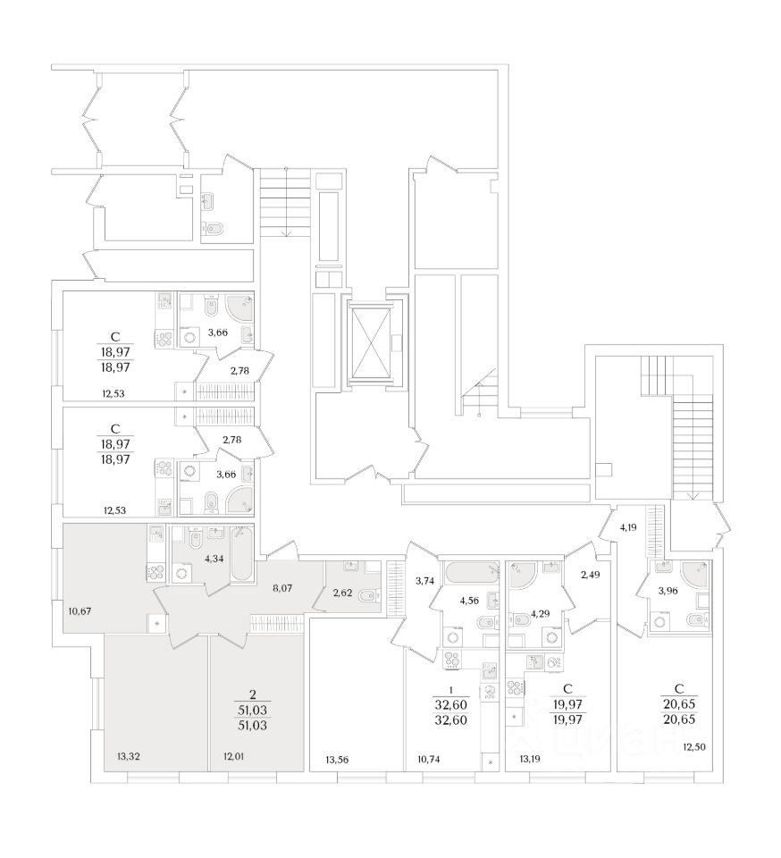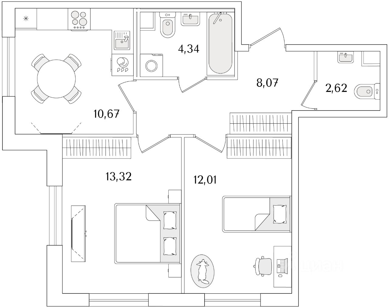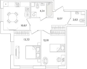 Квартира находится в 9 этажном доме, в Очередь 2, Корпус 2 на 1 этаже. Общая площадь квартиры 51,03 кв.м.