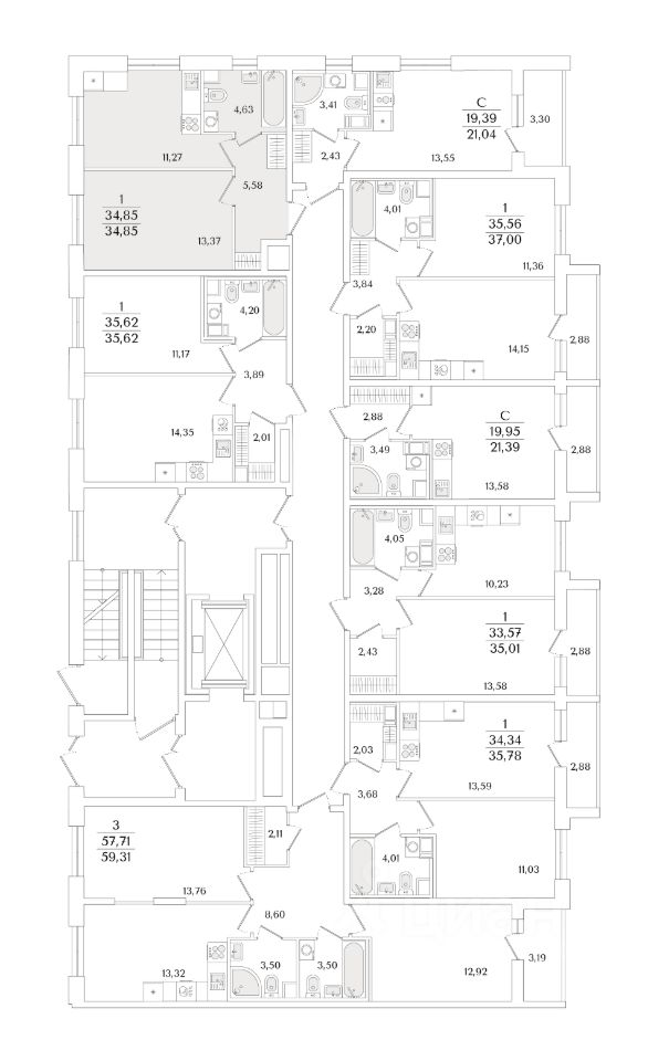 Квартира находится в 9 этажном доме, в Очередь 2, Корпус 2 на 2 этаже. Общая площадь квартиры 34,85 кв.м.