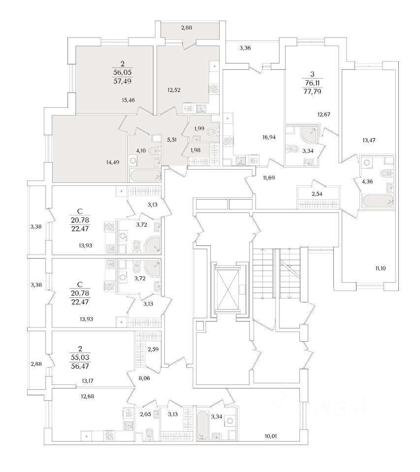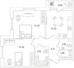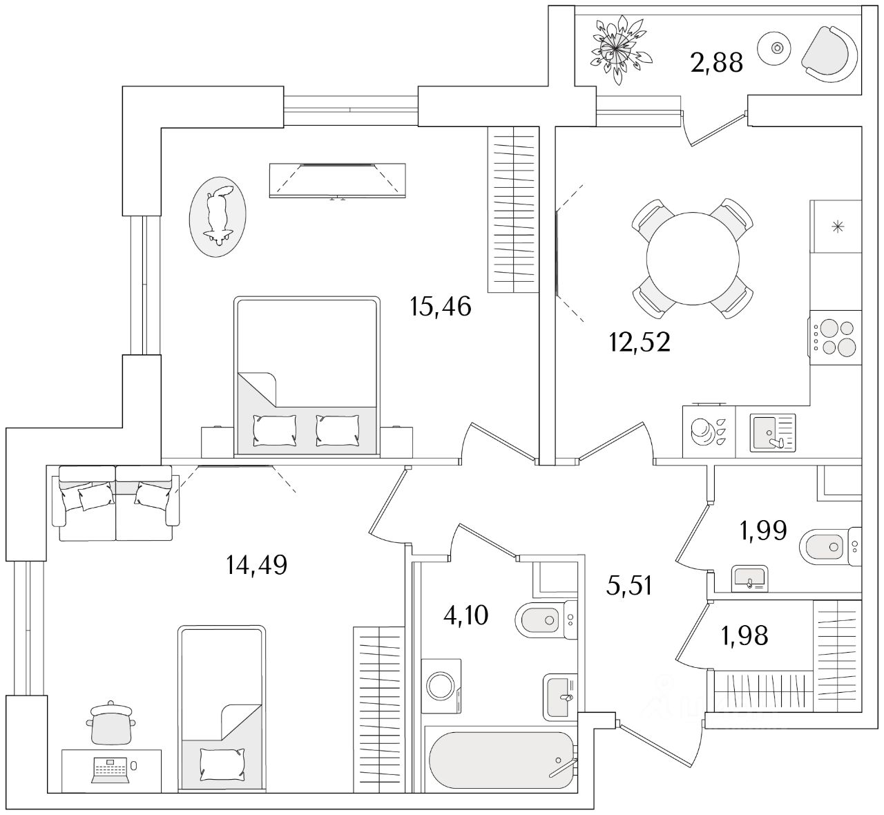 Квартира находится в 9 этажном доме, в Очередь 2, Корпус 2 на 2 этаже. Общая площадь квартиры 57,49 кв.м.