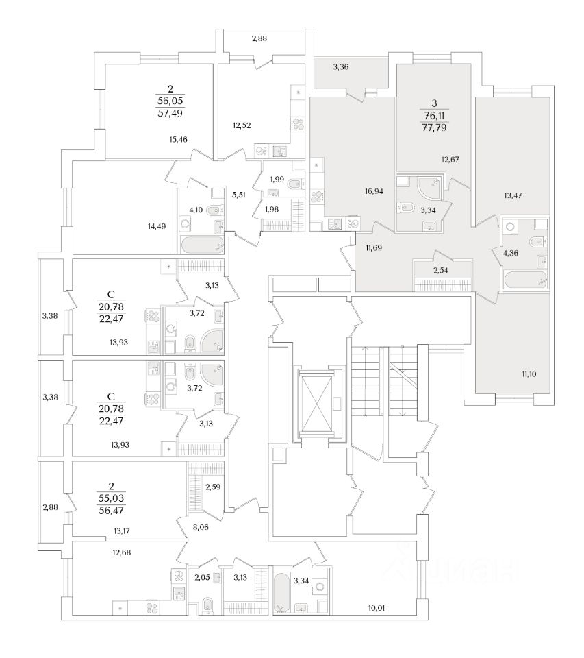 Квартира находится в 9 этажном доме, в Очередь 2, Корпус 2 на 2 этаже. Общая площадь квартиры 77,79 кв.м.
