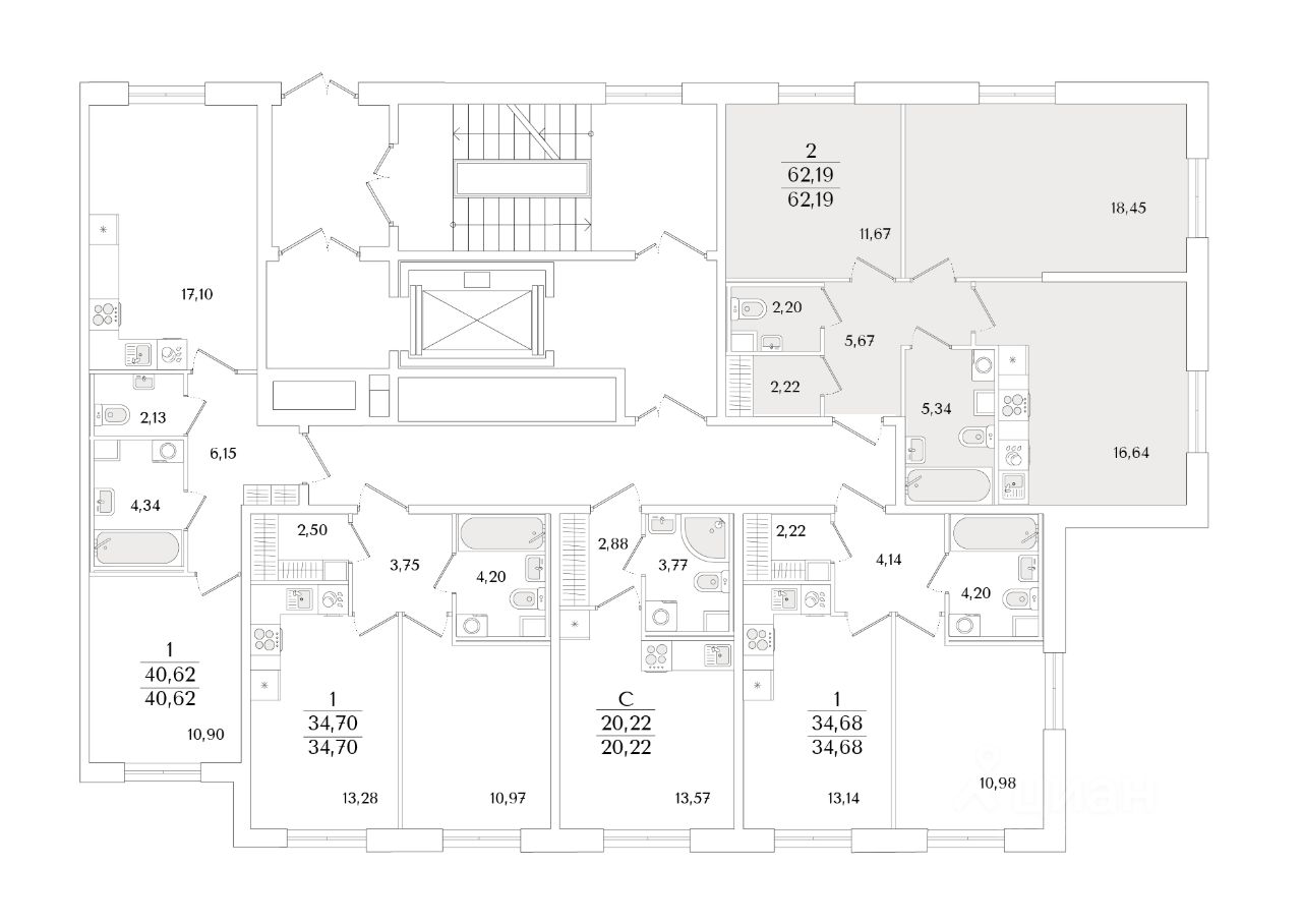 Квартира находится в 9 этажном доме, в Очередь 2, Корпус 2 на 2 этаже. Общая площадь квартиры 62,19 кв.м.
