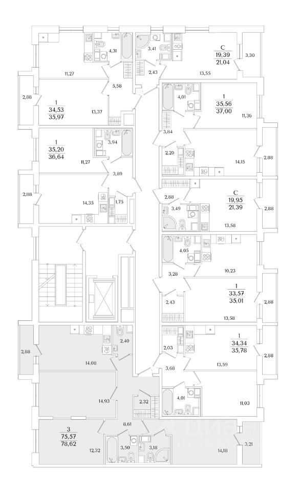 Квартира находится в 9 этажном доме, в Очередь 2, Корпус 2 на 3 этаже. Общая площадь квартиры 78,62 кв.м.