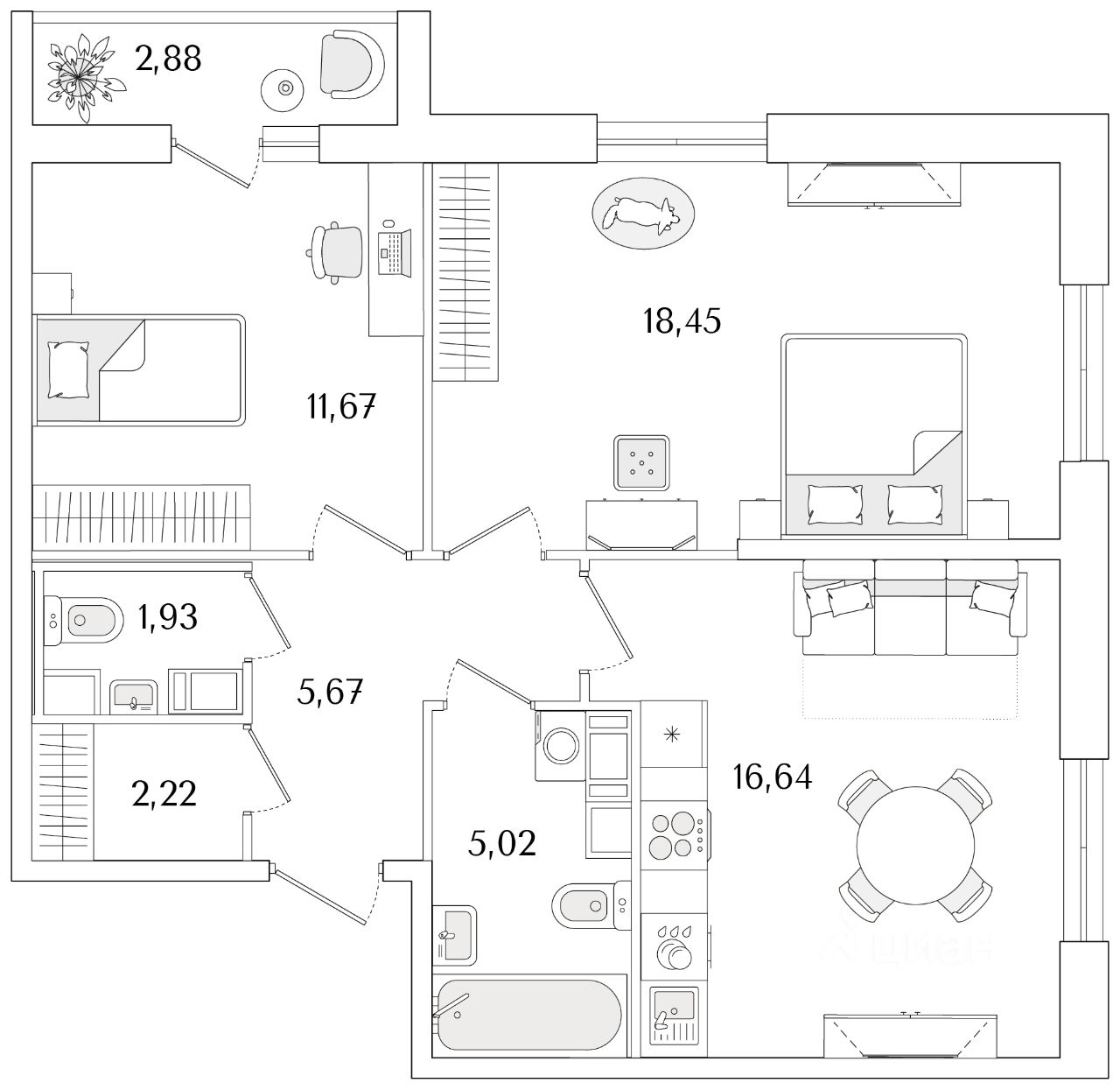 Квартира находится в 9 этажном доме, в Очередь 2, Корпус 2 на 3 этаже. Общая площадь квартиры 63,04 кв.м.