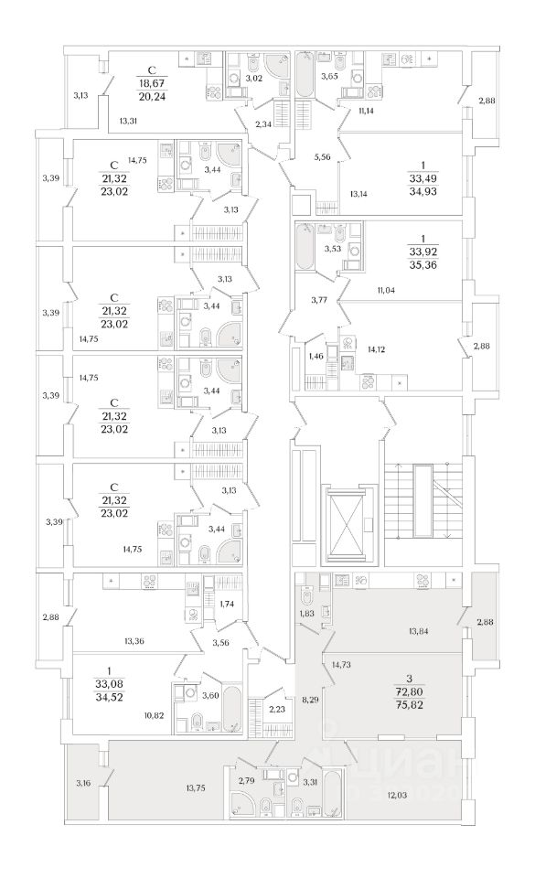 Квартира находится в 9 этажном доме, в Очередь 2, Корпус 2 на 5 этаже. Общая площадь квартиры 75,82 кв.м.