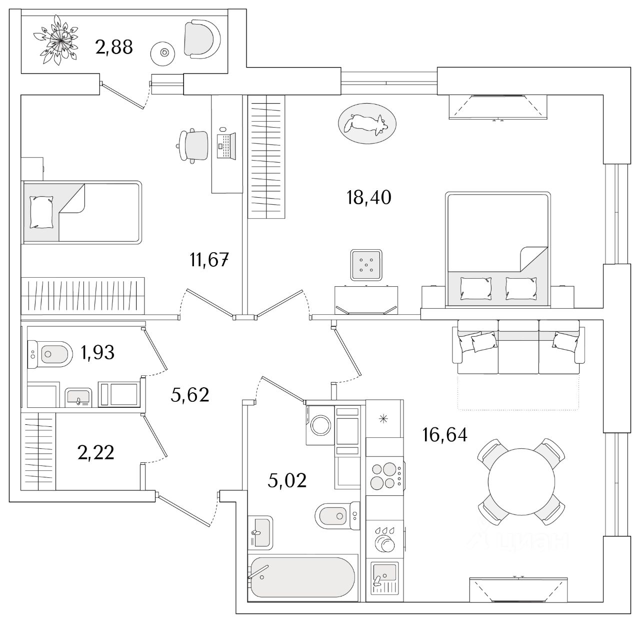 Квартира находится в 9 этажном доме, в Очередь 2, Корпус 2 на 6 этаже. Общая площадь квартиры 62,94 кв.м.
