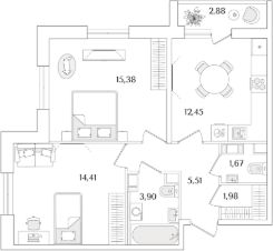Квартира находится в 9 этажном доме, в Очередь 2, Корпус 2 на 7 этаже. Общая площадь квартиры 56,74 кв.м.