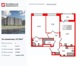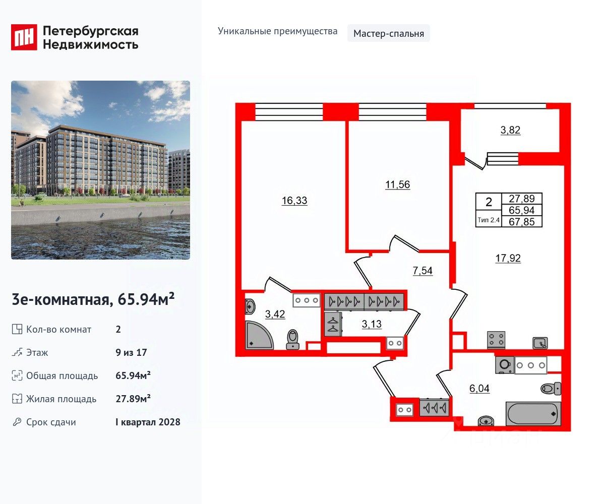 Уникальная, функциональная европланировка, большая кухня-гостиная 17.92 м², вместительная прихожая 7.54 м². Общая площадь квартиры - 65.94 м², жилая 27.89 м², высота потолка 2.77 м.