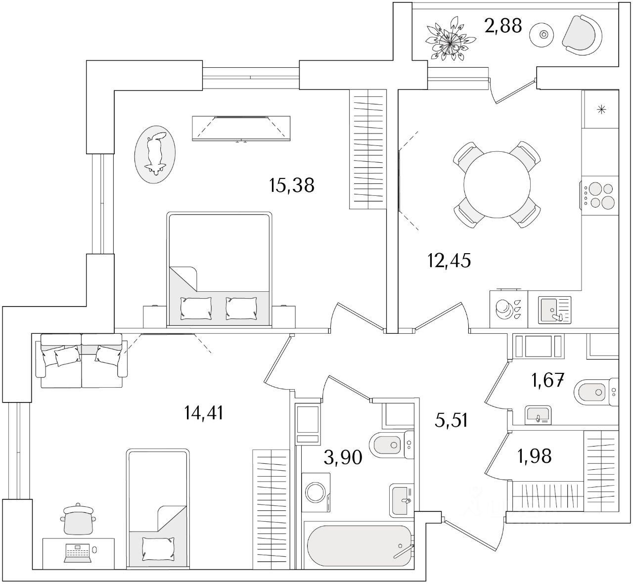 Квартира находится в 9 этажном доме, в Очередь 2, Корпус 2 на 9 этаже. Общая площадь квартиры 56,74 кв.м.