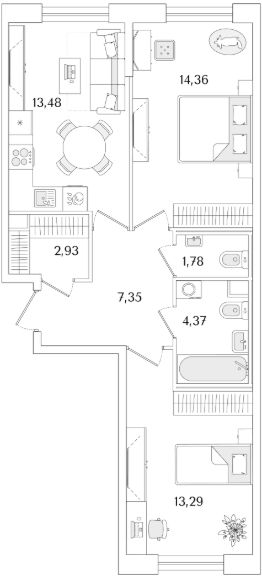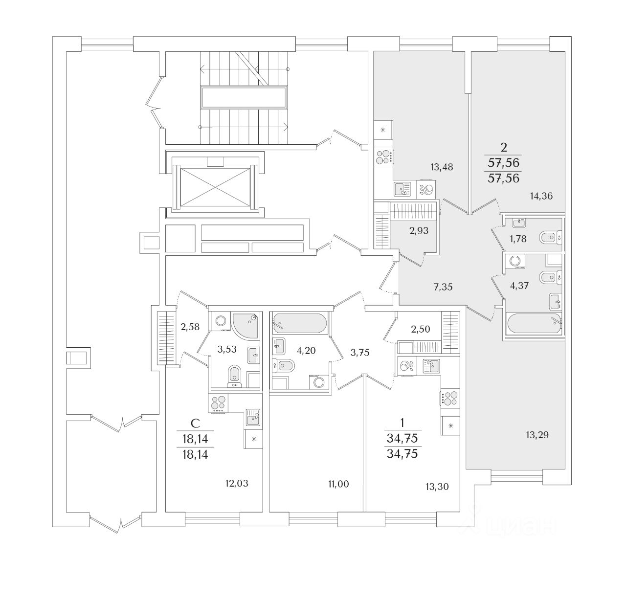 Квартира находится в 9 этажном доме, в Очередь 2, Корпус 1 на 2 этаже. Общая площадь квартиры 57,56 кв.м.