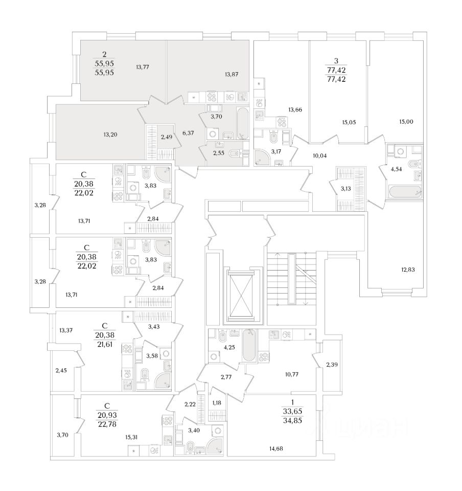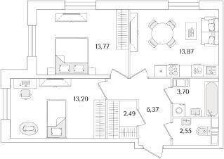 Квартира находится в 9 этажном доме, в Очередь 2, Корпус 1 на 3 этаже. Общая площадь квартиры 55,95 кв.м.