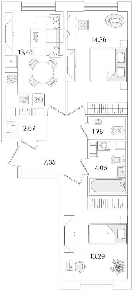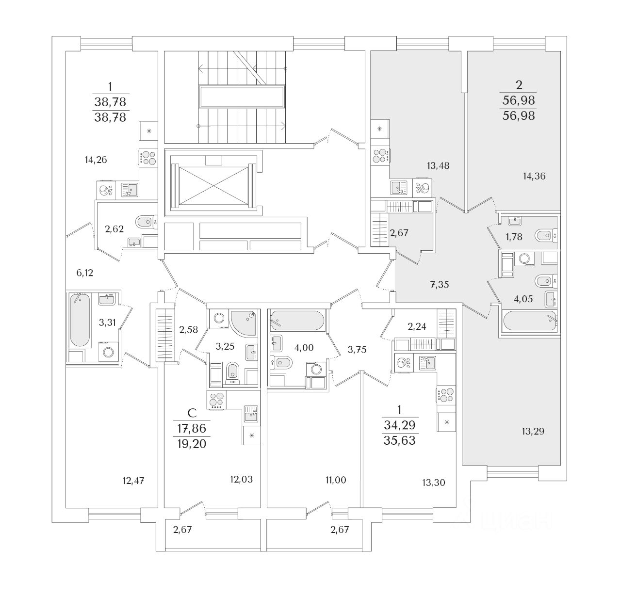Квартира находится в 9 этажном доме, в Очередь 2, Корпус 1 на 3 этаже. Общая площадь квартиры 56,98 кв.м.