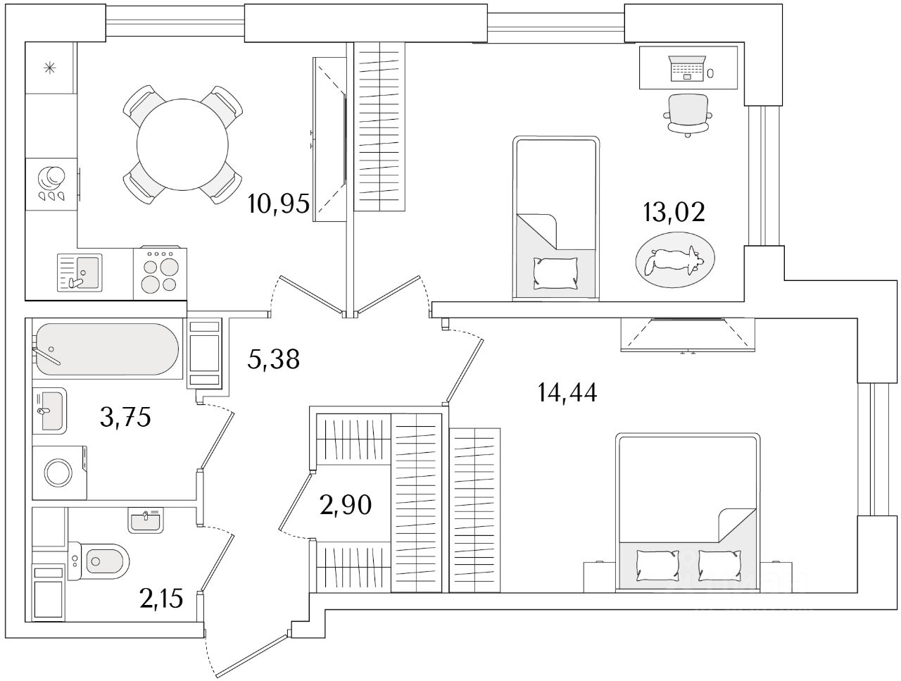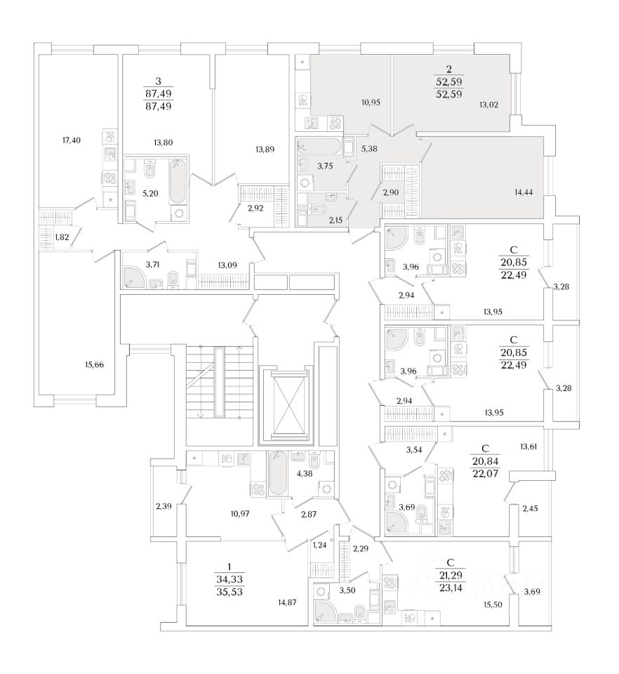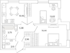 Квартира находится в 9 этажном доме, в Очередь 2, Корпус 1 на 3 этаже. Общая площадь квартиры 52,59 кв.м.