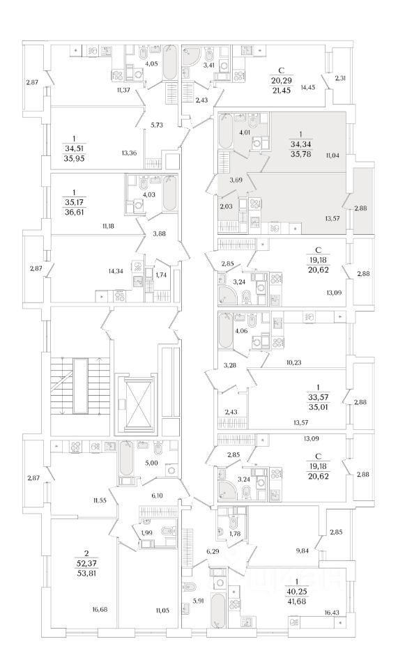 Квартира находится в 9 этажном доме, в Очередь 2, Корпус 1 на 4 этаже. Общая площадь квартиры 35,78 кв.м.