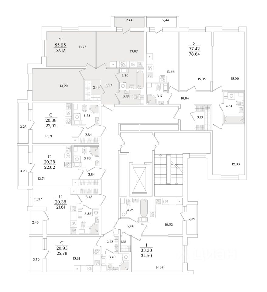 Квартира находится в 9 этажном доме, в Очередь 2, Корпус 1 на 5 этаже. Общая площадь квартиры 57,17 кв.м.