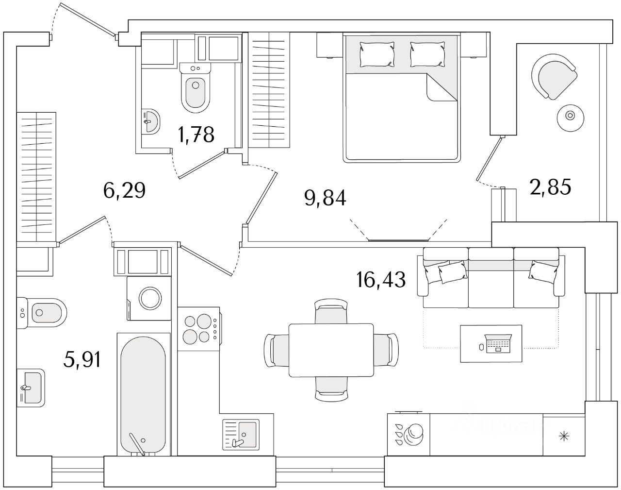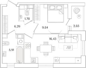 Квартира находится в 9 этажном доме, в Очередь 2, Корпус 1 на 7 этаже. Общая площадь квартиры 41,68 кв.м.