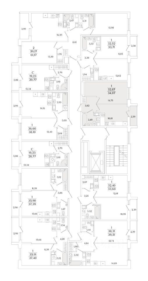 Квартира находится в 9 этажном доме, в Очередь 2, Корпус 1 на 9 этаже. Общая площадь квартиры 34,07 кв.м.