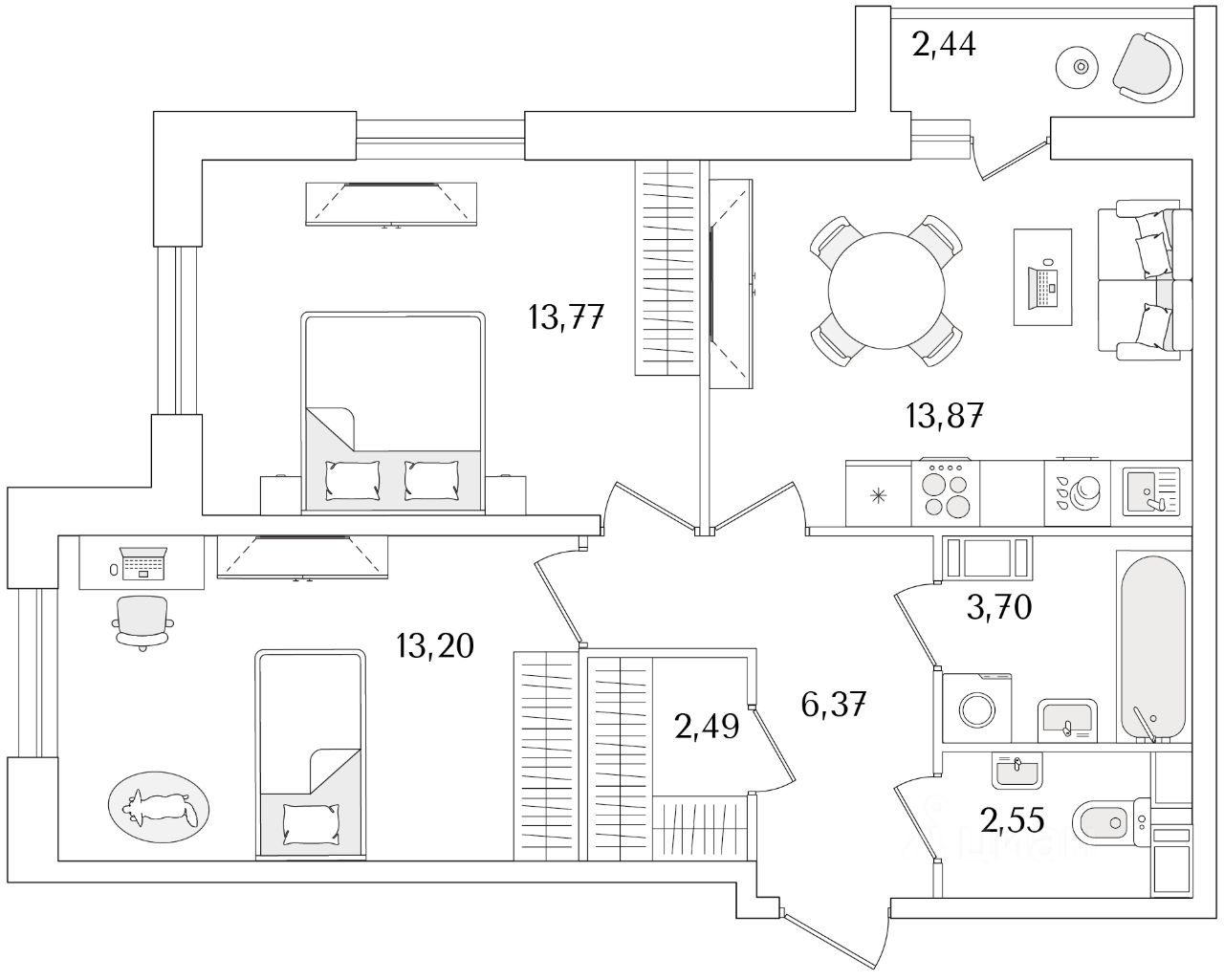 Квартира находится в 9 этажном доме, в Очередь 2, Корпус 1 на 9 этаже. Общая площадь квартиры 57,17 кв.м.