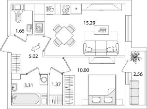 Квартира находится в 9 этажном доме, в Очередь 1, Корпус 1 на 9 этаже. Общая площадь квартиры 37,92 кв.м.