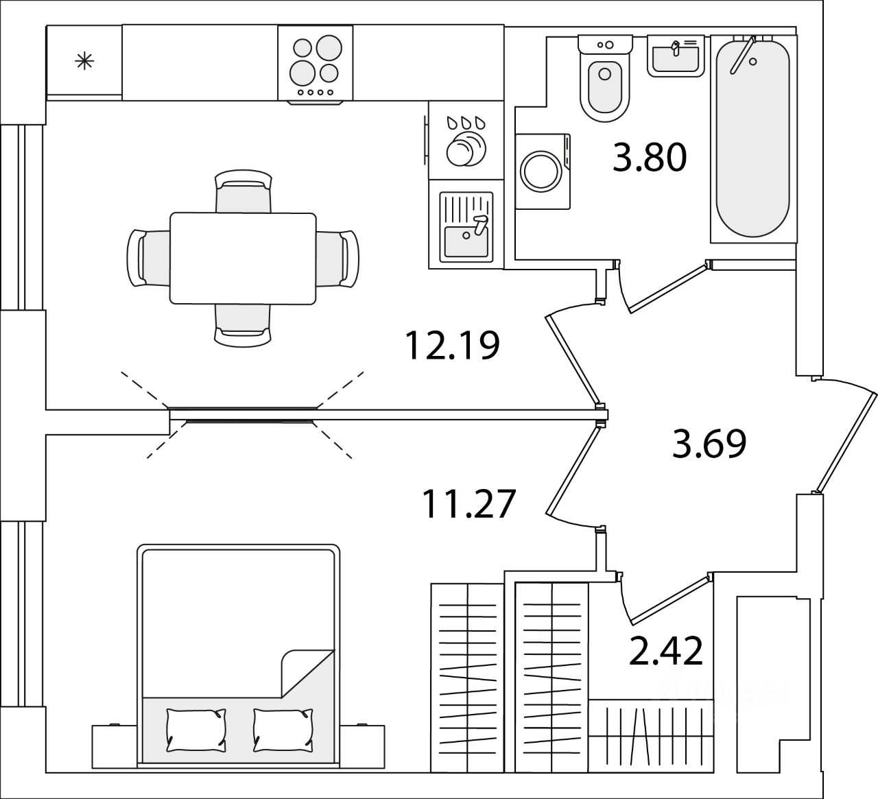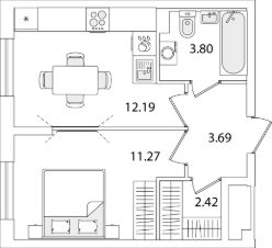 Квартира находится в 9 этажном доме, в Очередь 1, Корпус 1 на 1 этаже. Общая площадь квартиры 33,37 кв.м.
