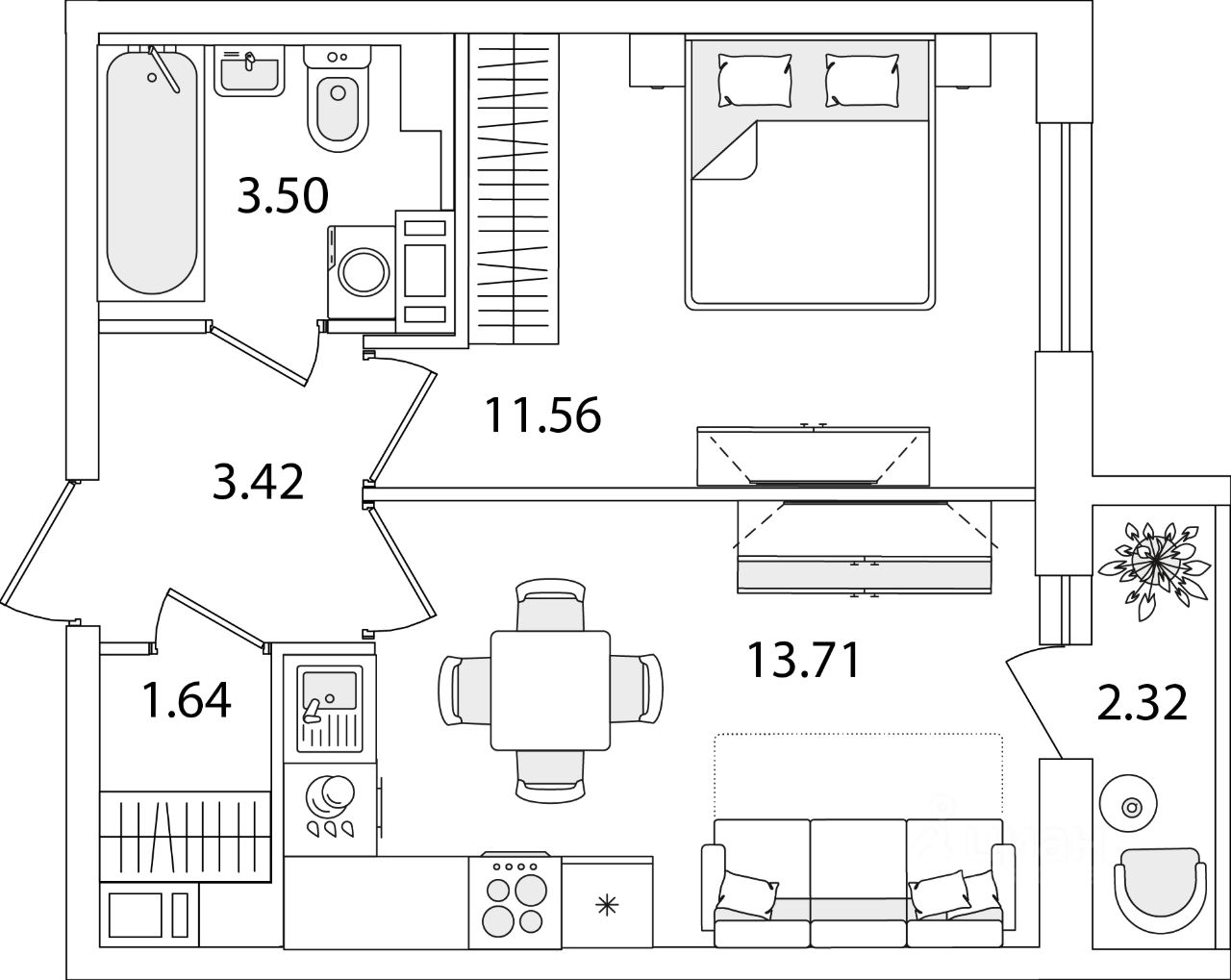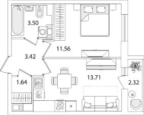 Квартира находится в 9 этажном доме, в Очередь 1, Корпус 1 на 9 этаже. Общая площадь квартиры 34,99 кв.м.