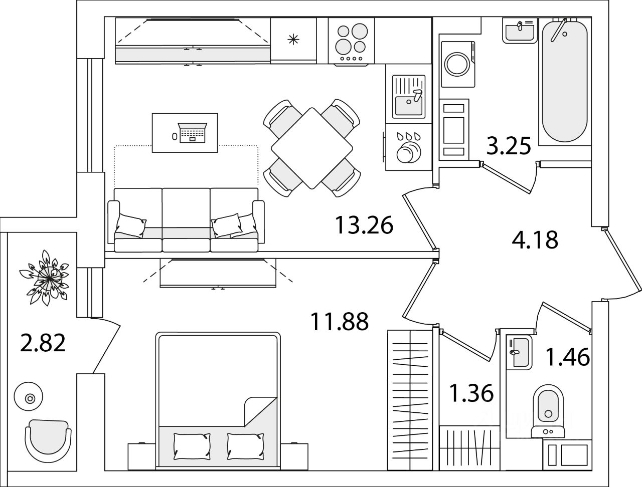 Квартира находится в 9 этажном доме, в Очередь 1, Корпус 1 на 9 этаже. Общая площадь квартиры 36,80 кв.м.