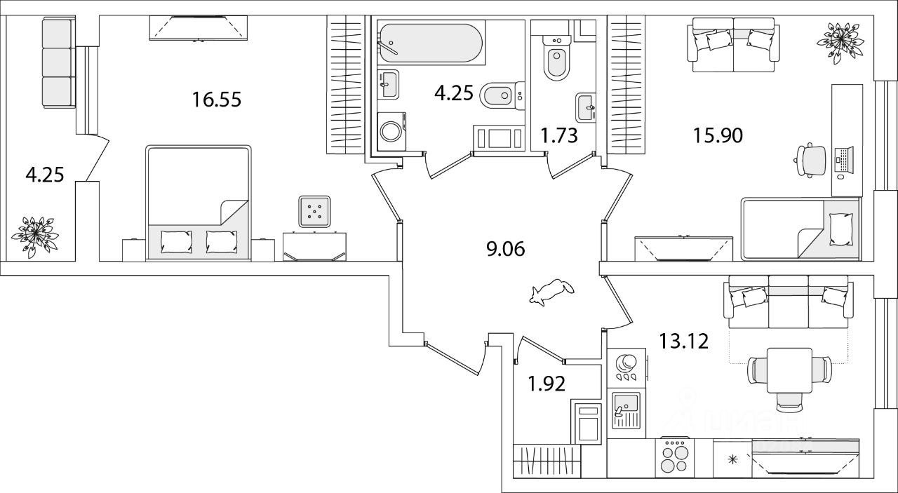 Квартира находится в 9 этажном доме, в Очередь 1, Корпус 1 на 9 этаже. Общая площадь квартиры 64,50 кв.м.