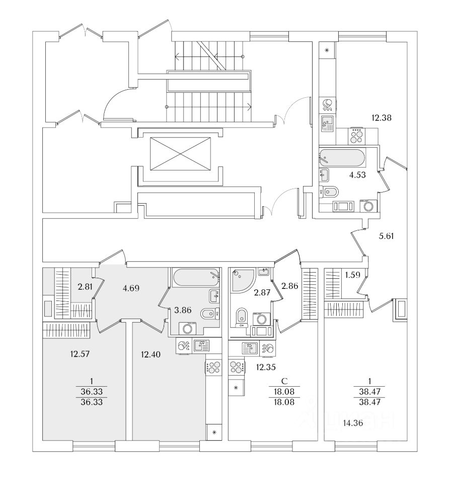 Квартира находится в 9 этажном доме, в Очередь 1, Корпус 1 на 2 этаже. Общая площадь квартиры 36,33 кв.м.