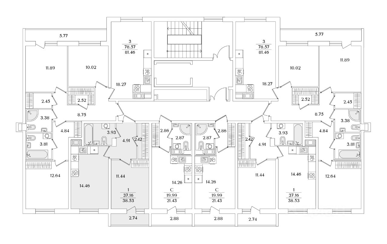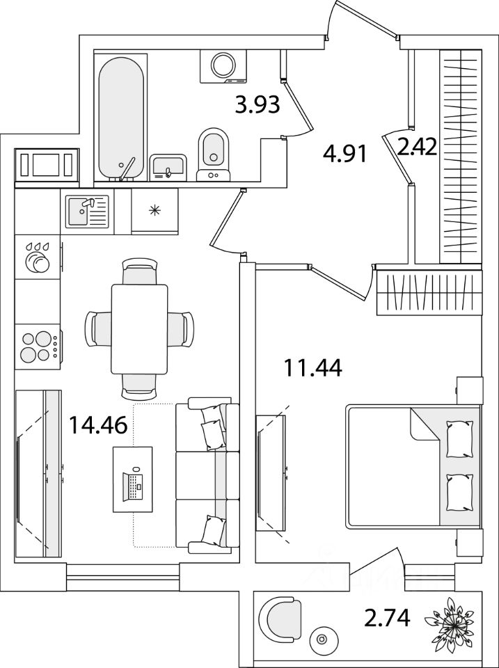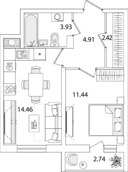 Квартира находится в 9 этажном доме, в Очередь 1, Корпус 1 на 4 этаже. Общая площадь квартиры 38,53 кв.м.