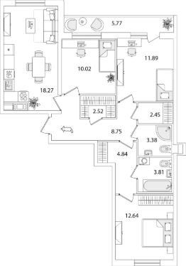 Квартира находится в 9 этажном доме, в Очередь 1, Корпус 1 на 8 этаже. Общая площадь квартиры 81,11 кв.м.