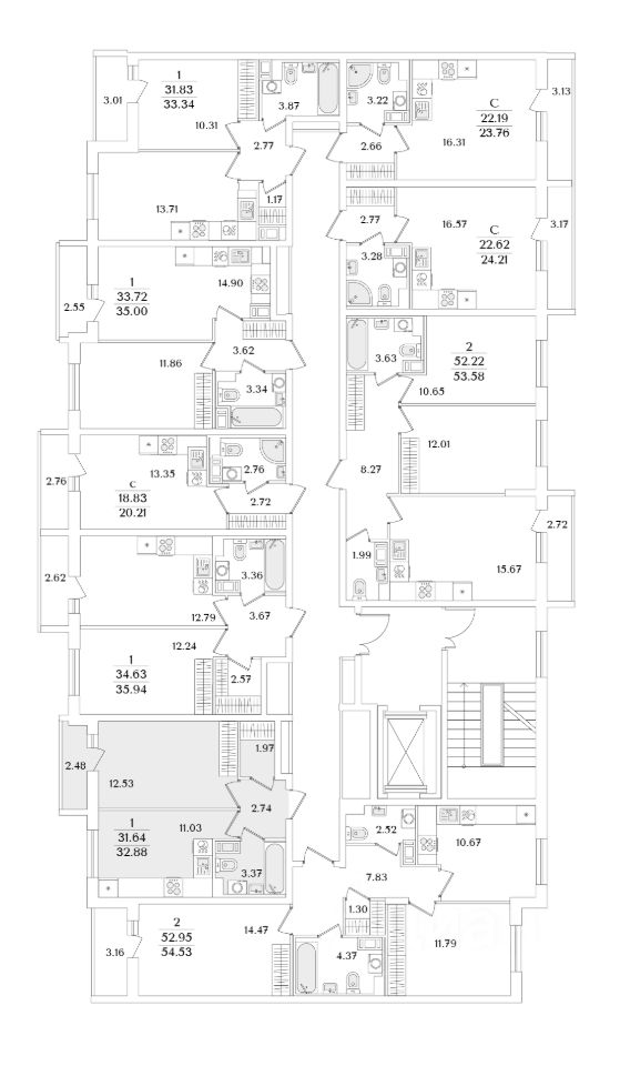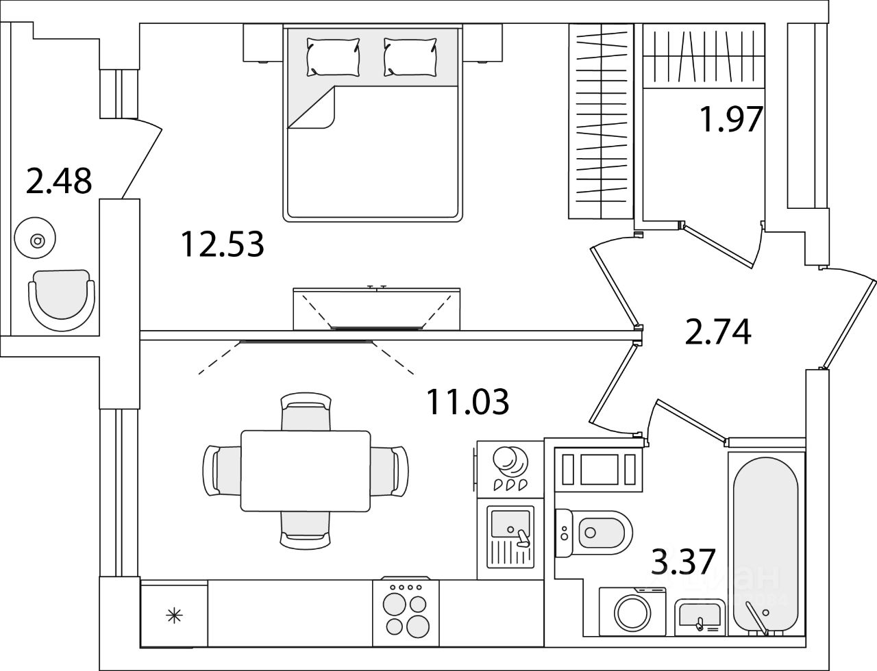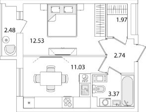 Квартира находится в 9 этажном доме, в Очередь 1, Корпус 1 на 7 этаже. Общая площадь квартиры 32,88 кв.м.