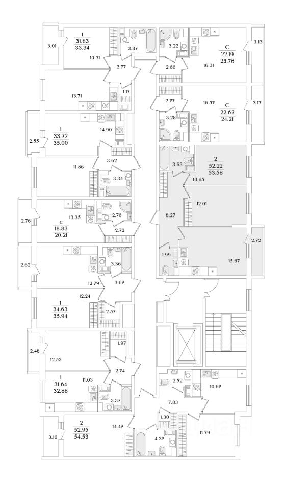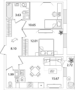 Квартира находится в 9 этажном доме, в Очередь 1, Корпус 1 на 8 этаже. Общая площадь квартиры 53,58 кв.м.