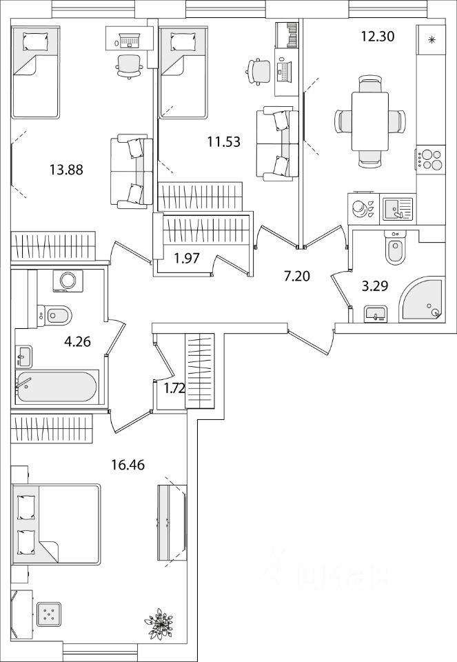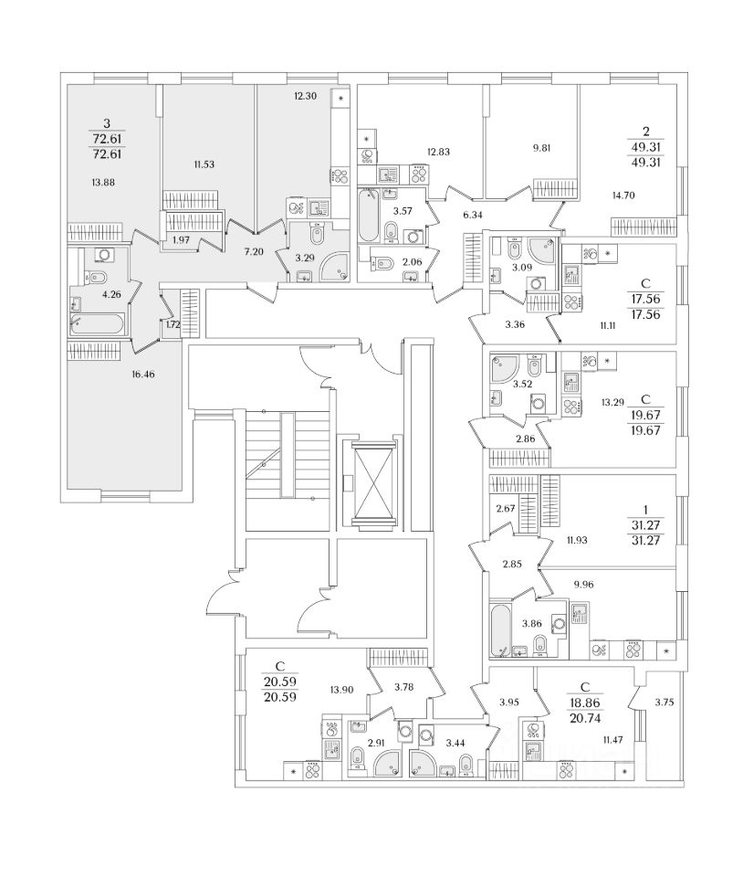 Квартира находится в 9 этажном доме, в Очередь 1, Корпус 1 на 2 этаже. Общая площадь квартиры 72,61 кв.м.