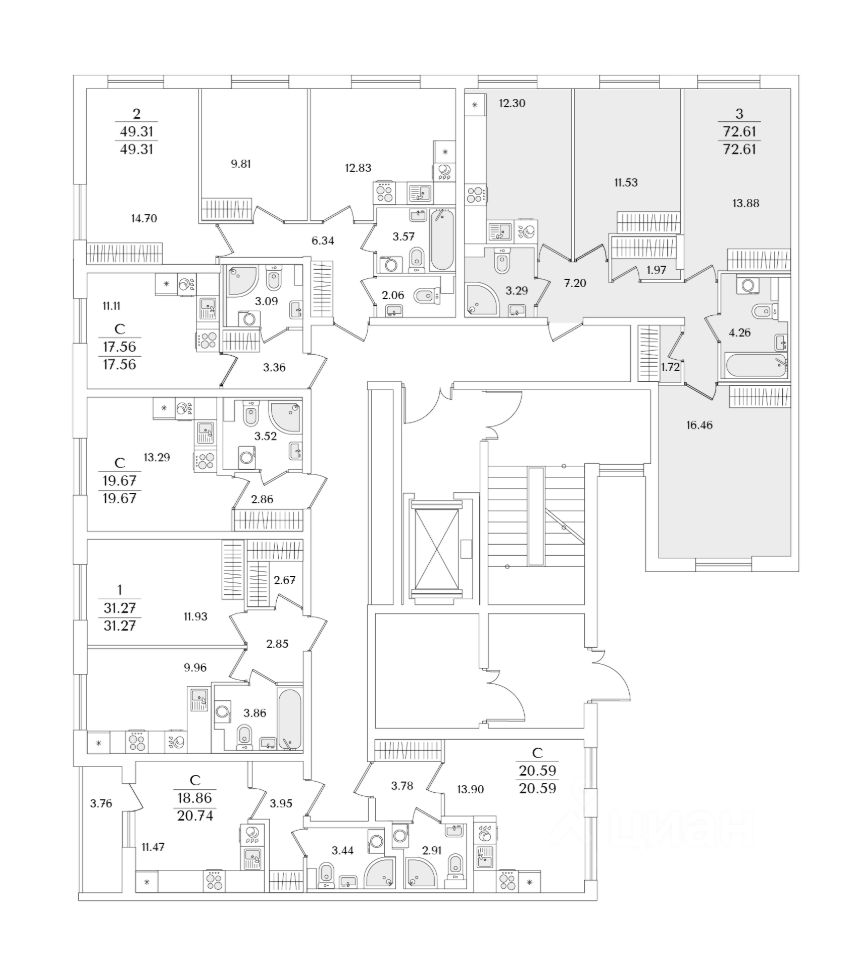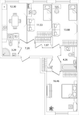 Квартира находится в 9 этажном доме, в Очередь 1, Корпус 1 на 2 этаже. Общая площадь квартиры 72,61 кв.м.