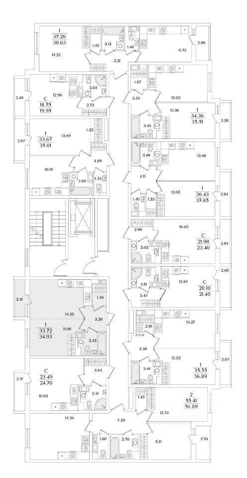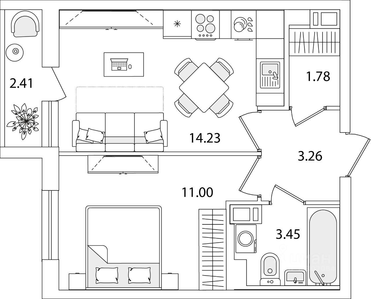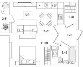 Квартира находится в 9 этажном доме, в Очередь 1, Корпус 1 на 7 этаже. Общая площадь квартиры 34,93 кв.м.
