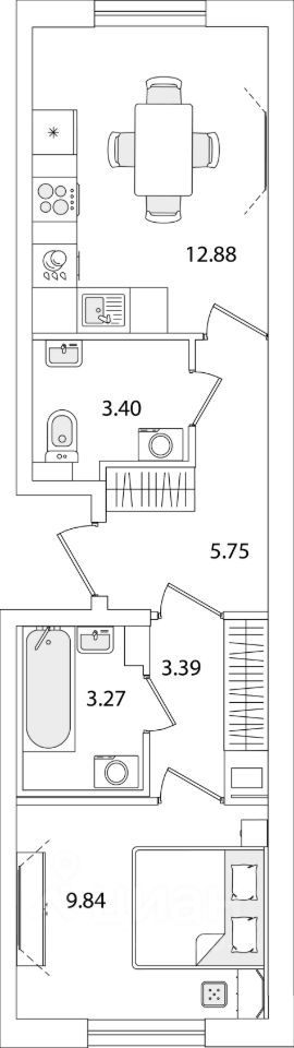 Квартира находится в 9 этажном доме, в Очередь 1, Корпус 1 на 2 этаже. Общая площадь квартиры 38,53 кв.м.
