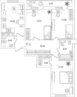 Квартира находится в 9 этажном доме, в Очередь 1, Корпус 1 на 7 этаже. Общая площадь квартиры 77,25 кв.м.